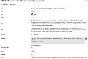 如上圖所示,檢測結(jié)果發(fā)現(xiàn)dbo賬戶被當作普通用戶去使用,這被標記為中等風(fēng)險,因為dbo具有最高的權(quán)限,ADS功能會針對不同風(fēng)險給出相應(yīng)建議與解決方法。